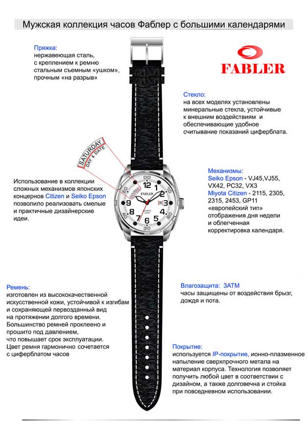 Предлагаем Вашему вниманию новую коллекцию мужских часов Фаблер на ремне с большими календарями. Благодаря тщательному подходу к разработке этой модельной линии коллекция получилась очень практичной и привлекательной. В качестве несомненных достоинств хотелось бы отметить следующее: